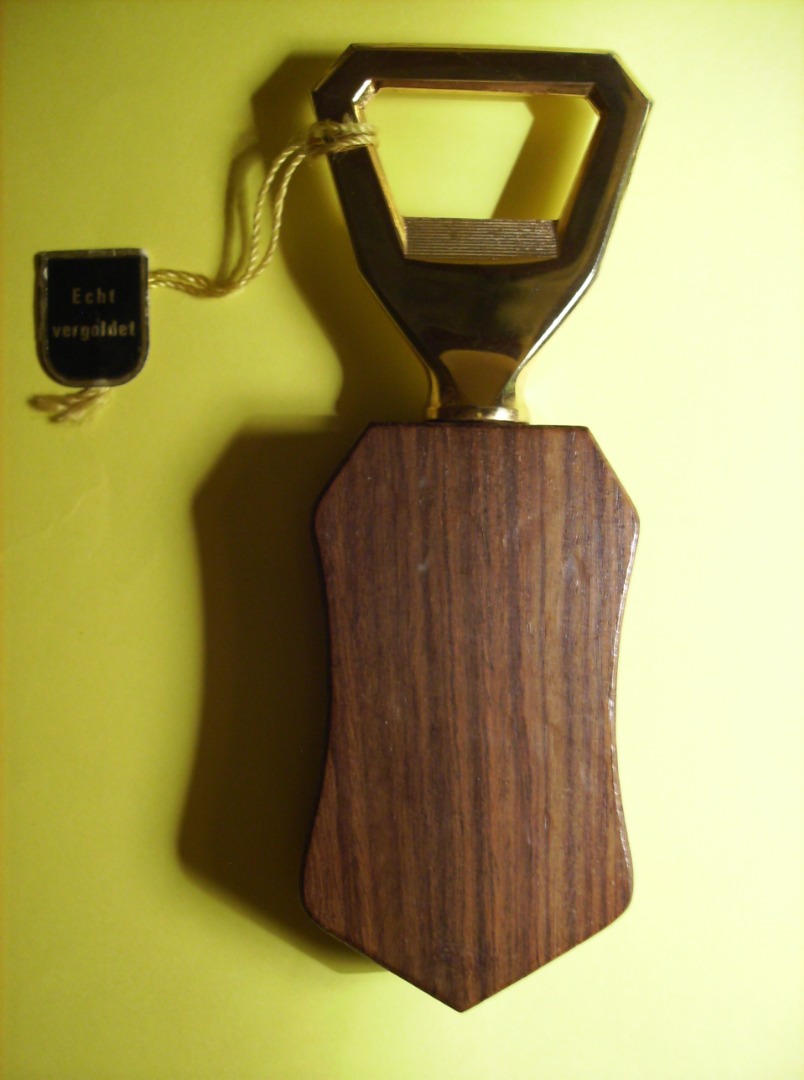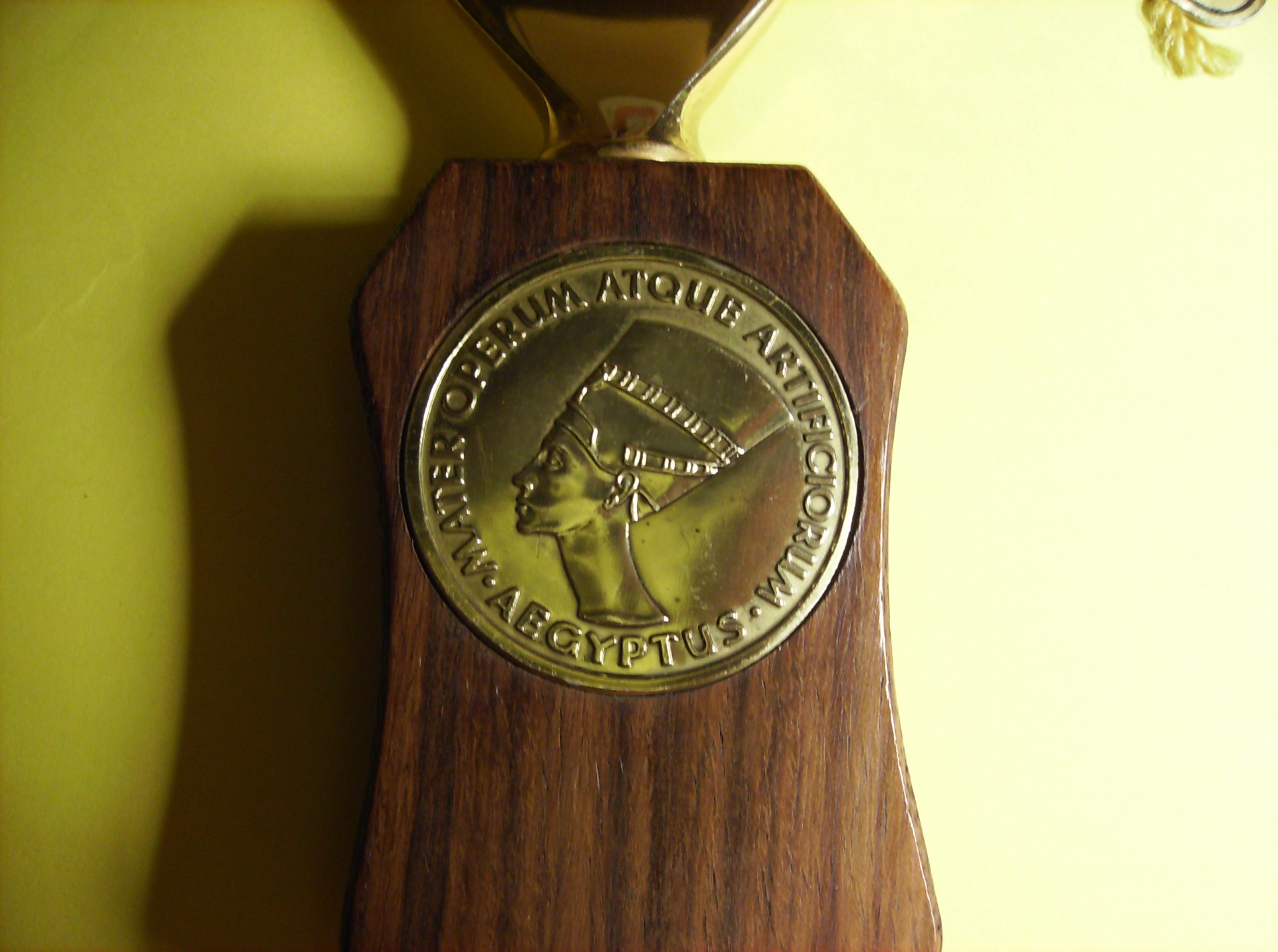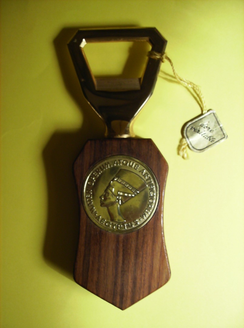 A Bottle opener with a Mater Operum Atque Artificiorum Aegyptus Coin. With depiction of the Egyption pharaoh Nefertiti. The handle is made of wood and the bottle opener part and the coin are gold-plated.