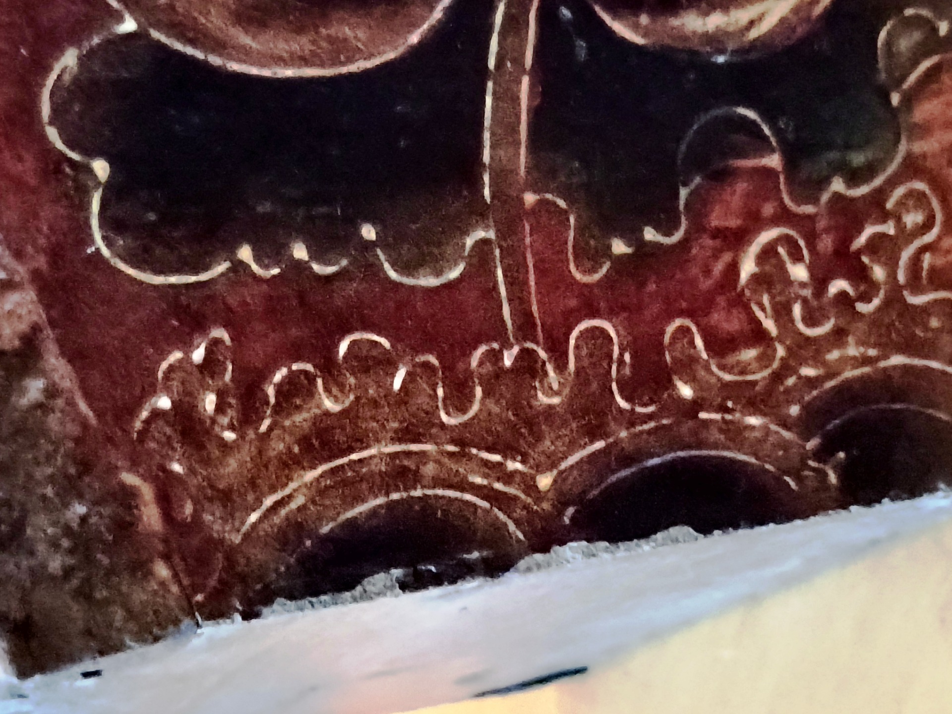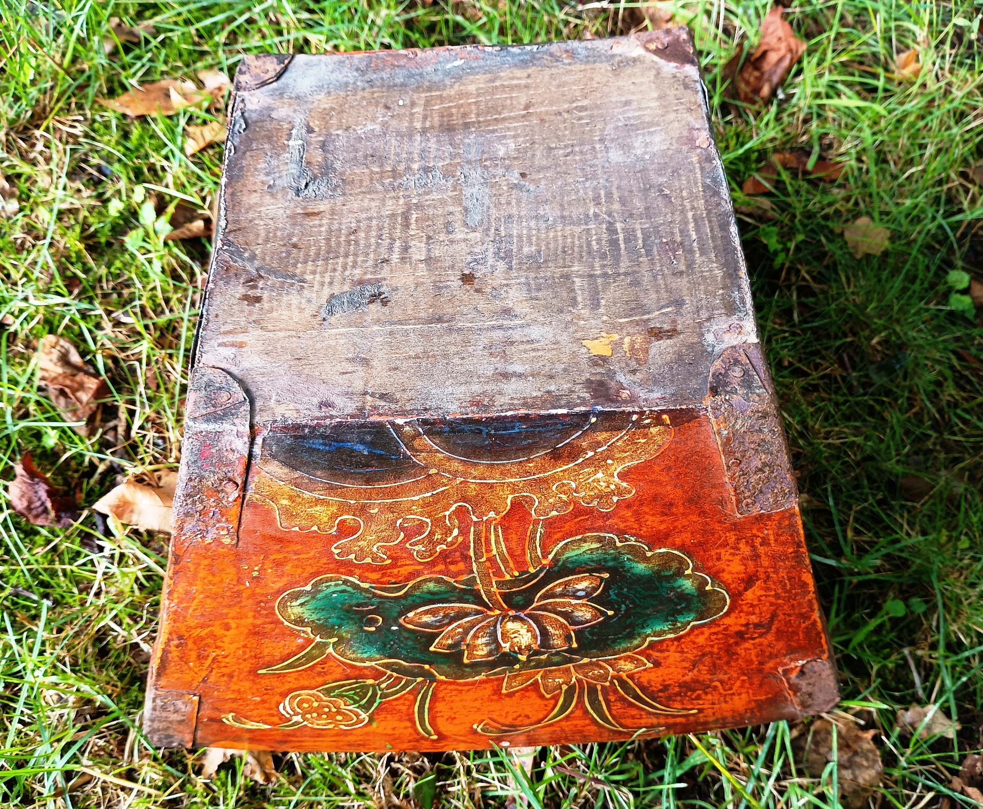 aan de onderrand op 2 plekken de verf- en laklaag er af.