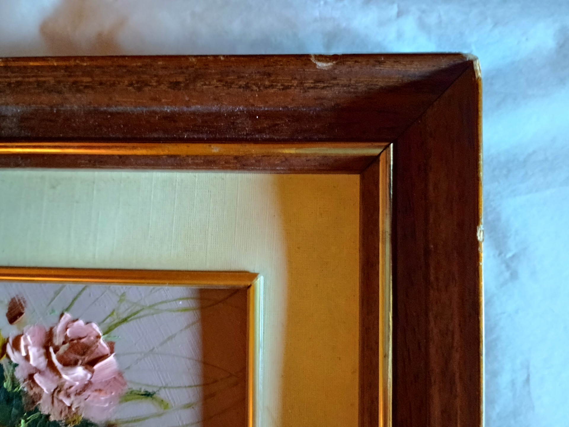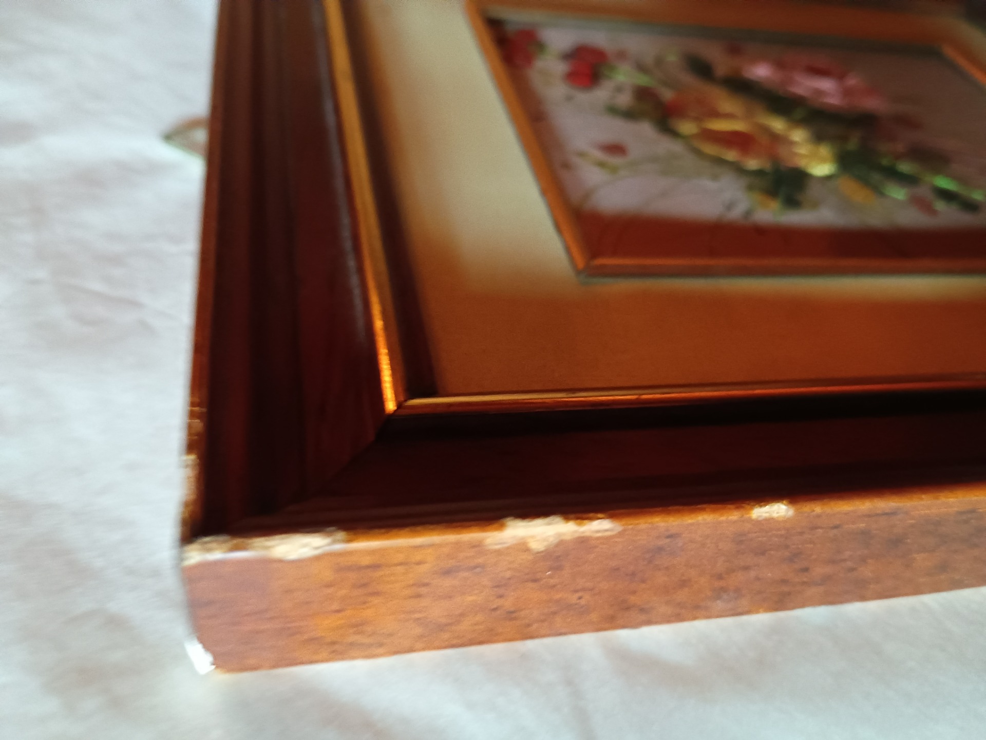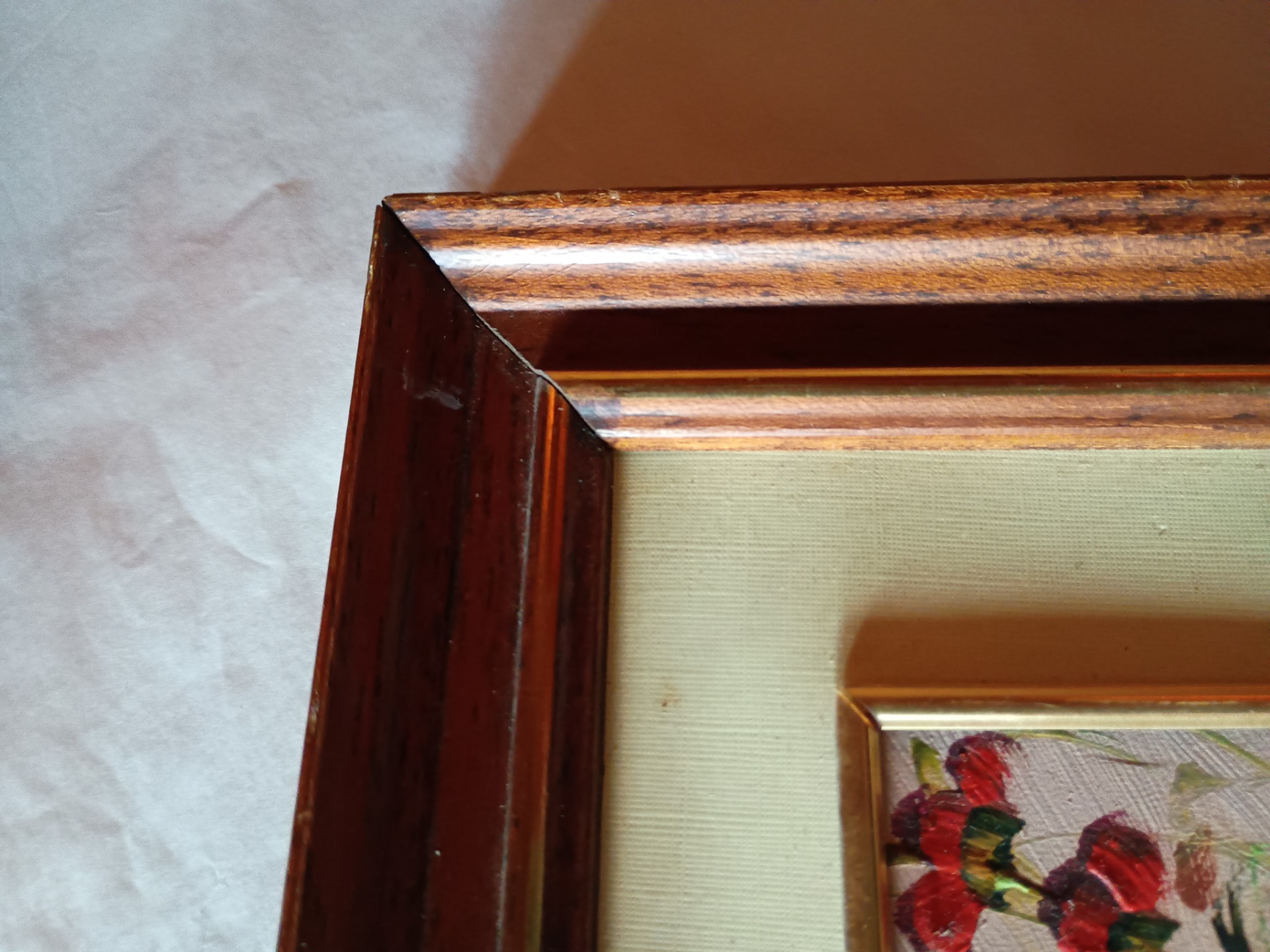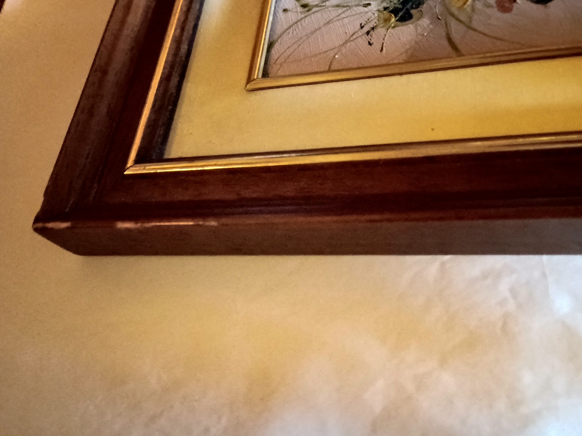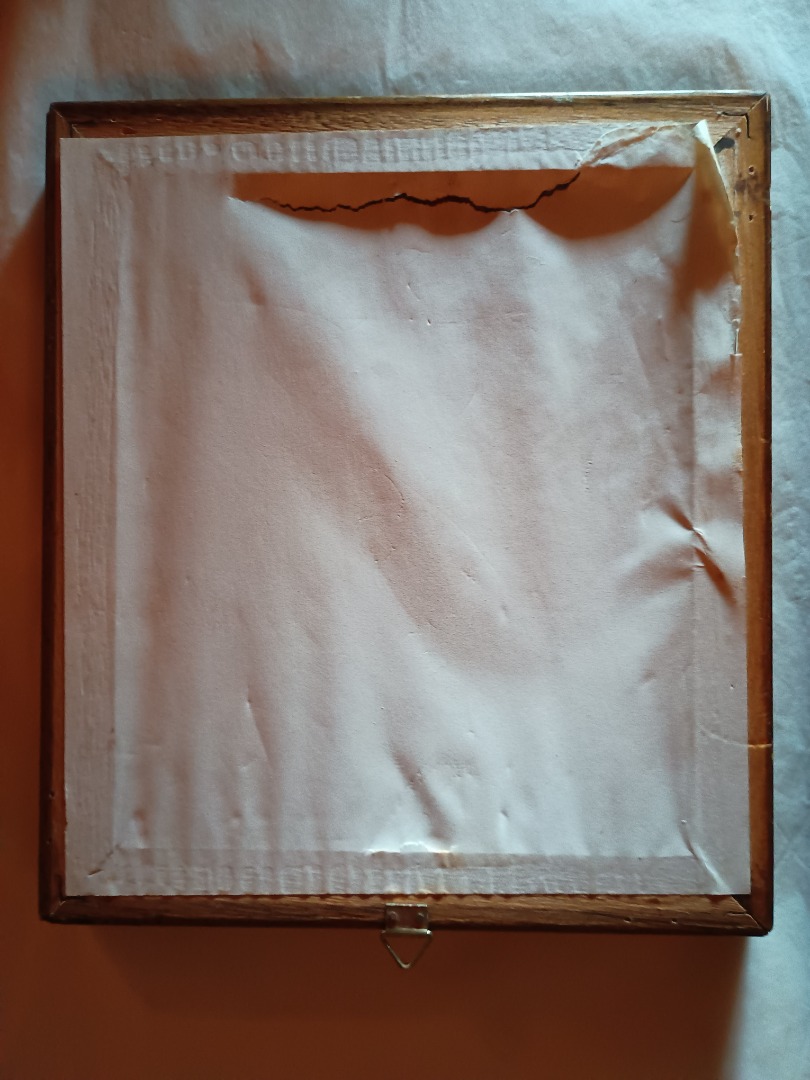 Vintage staat. Er zitten wat vage vlekken op het passepartout en wat beschadigingen op de omlijsting.