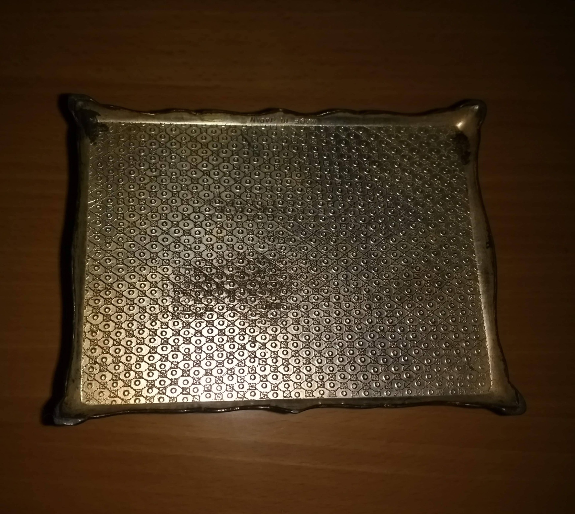 De bovenkant van de doos (deksel) toont wat slijtage, waarschijnlijk veroorzaakt door poetsen van het koper