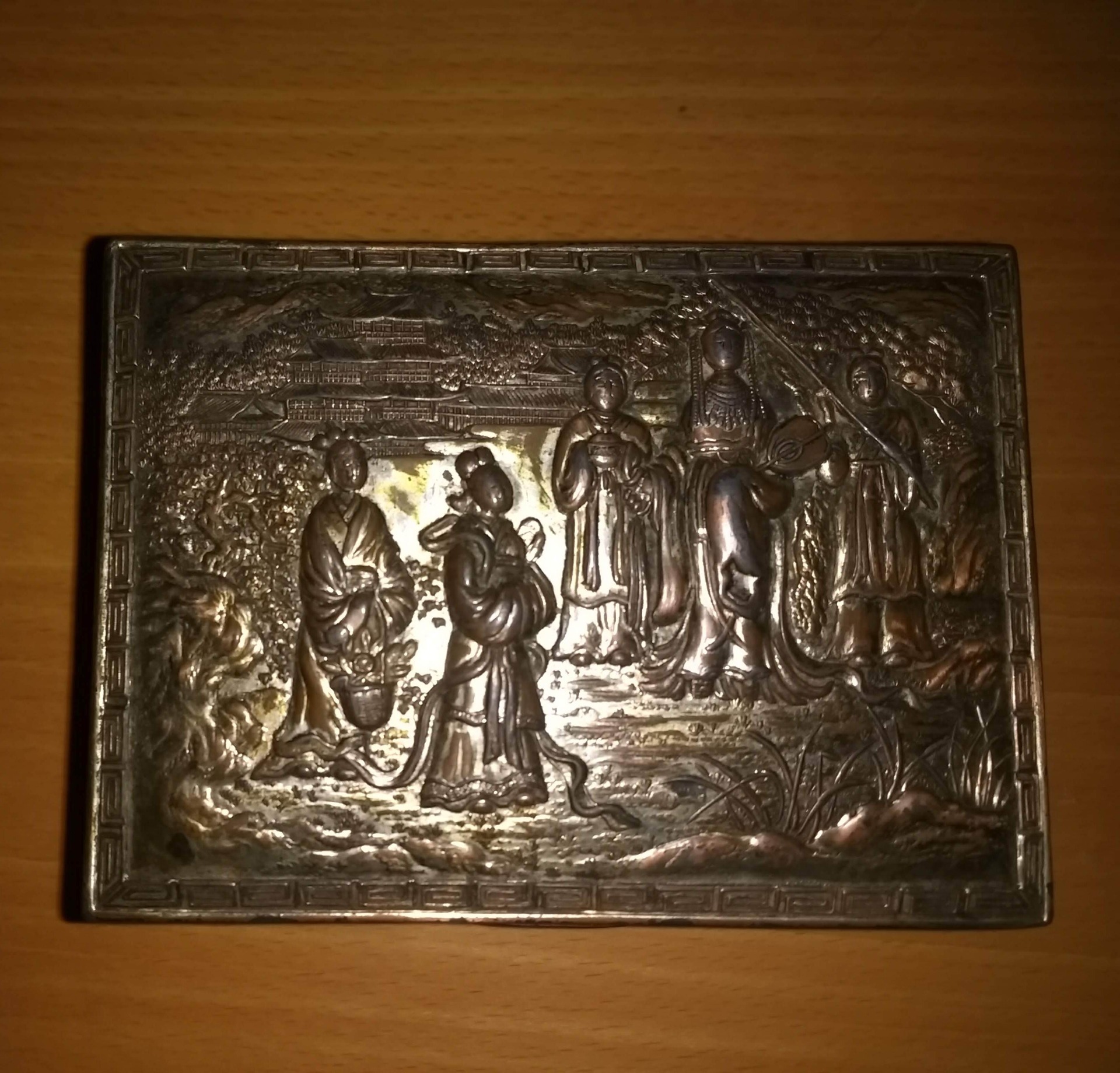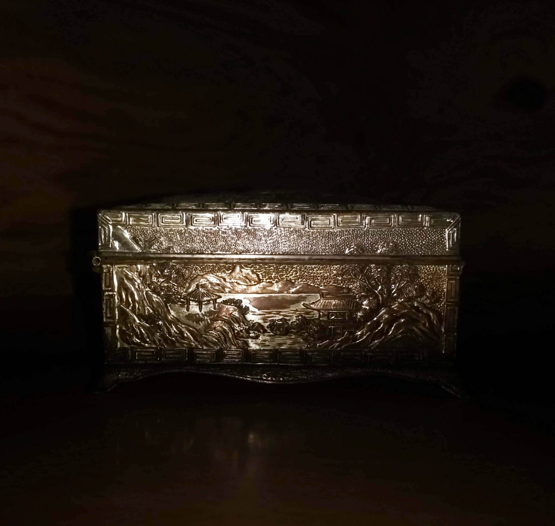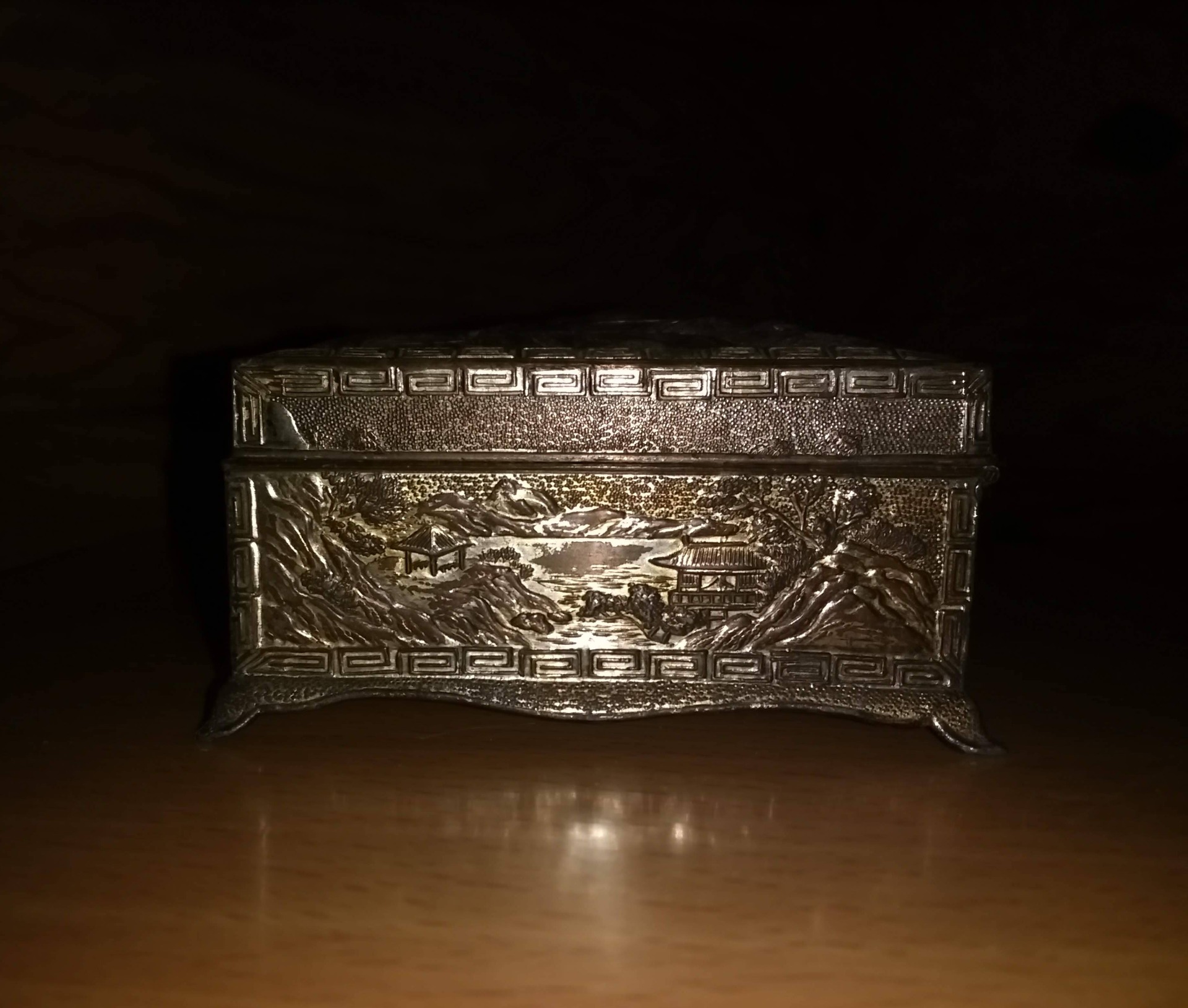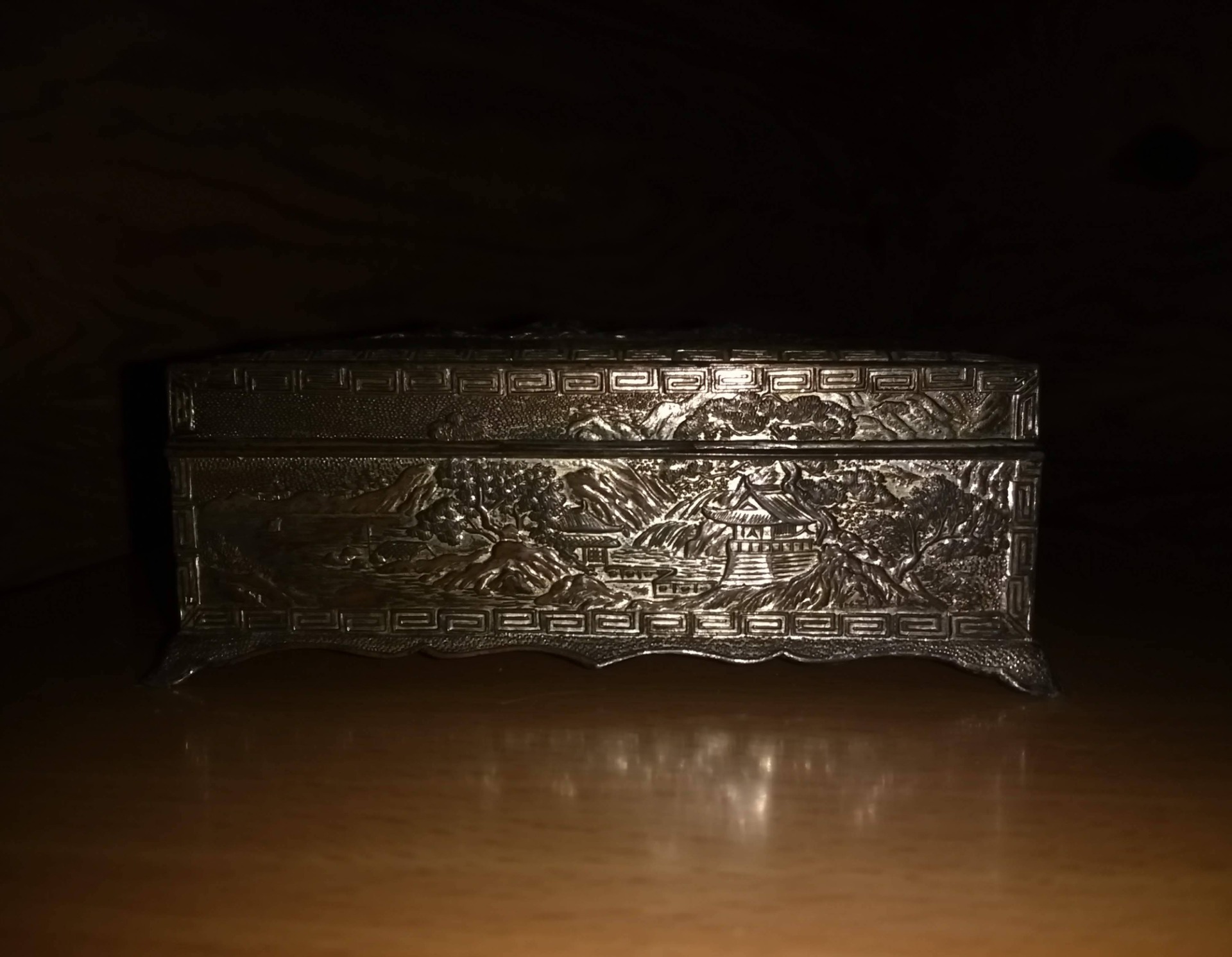Een kleine koperen doos op voetjes met deksel met Aziatische afbeelding