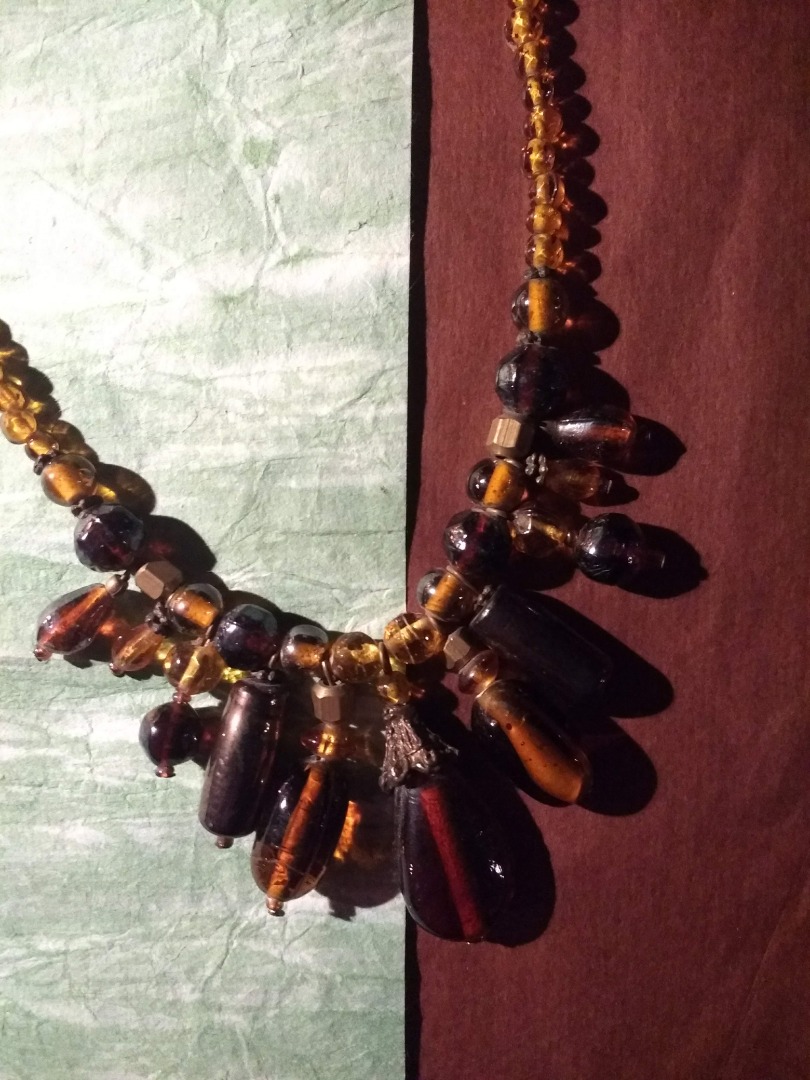 A vintage Necklace made up of beads in the colours oker, brown and red-brown.